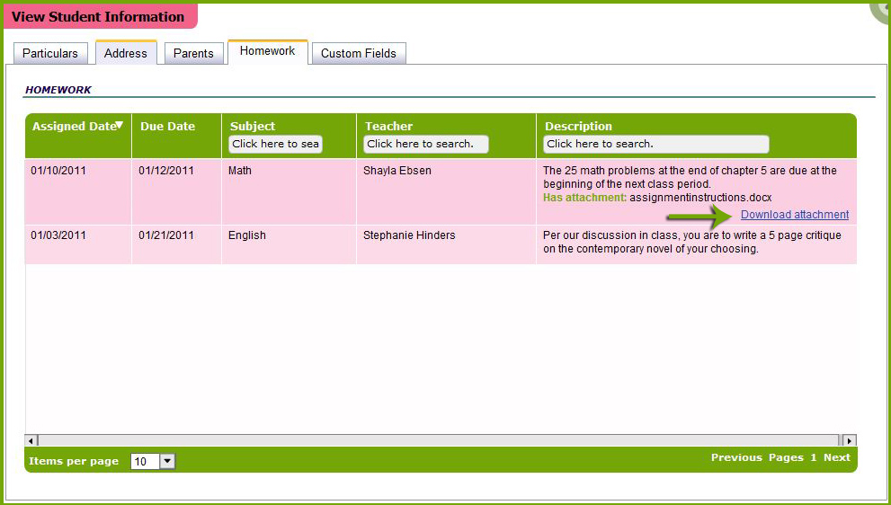 When students login to their QuickSchools.com accounts, they can quickly navigate to the homework tab on their account page to download each attachment provided to them by various instructors.