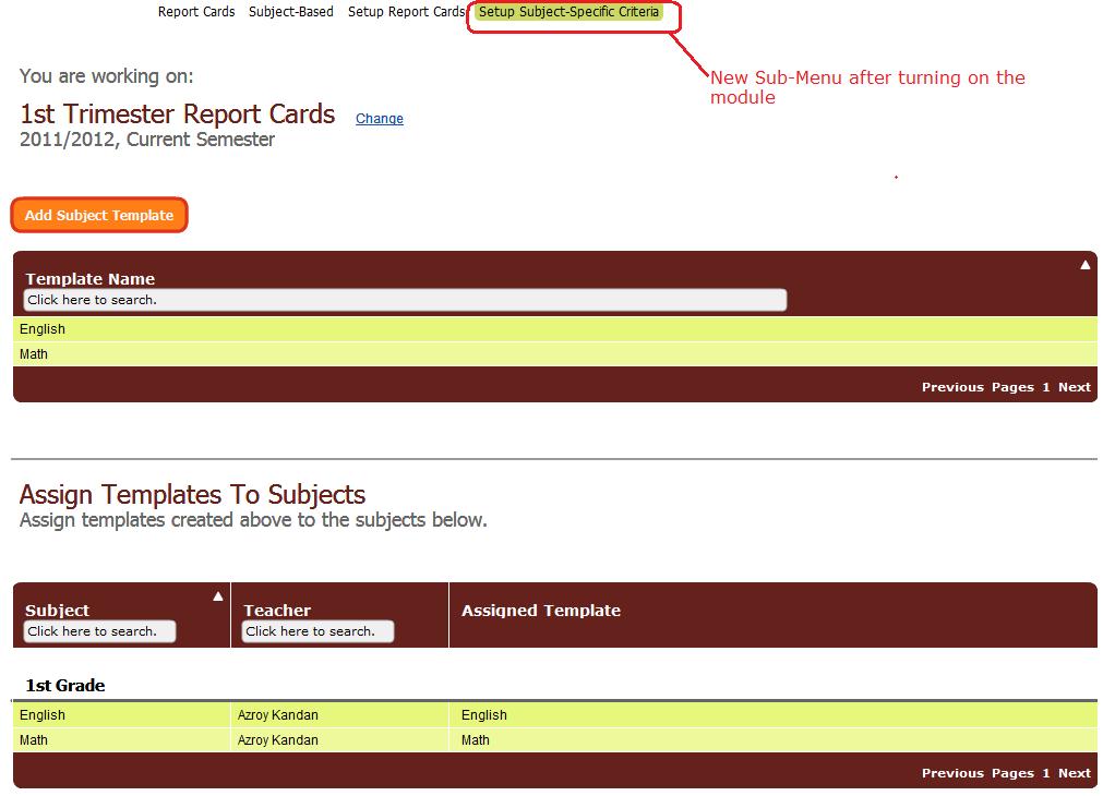 Once the module is turned on, you will see a new “Setup Subject-Specific Criteria” sub-menu appear next to “Setup Report Cards”. Clicking on it will show the screen below. You’ll notice that this module has 2 sections. The top section shows all the subject templates, while the bottom section shows all subjects, and the subject templates assigned to those subjects.