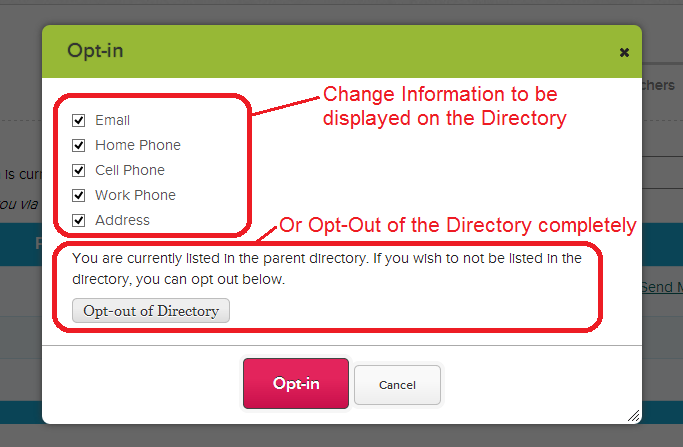Individual parents can also opt out completely from the Parent Directory, which will disallow other parents from contacting them via Private Messaging.