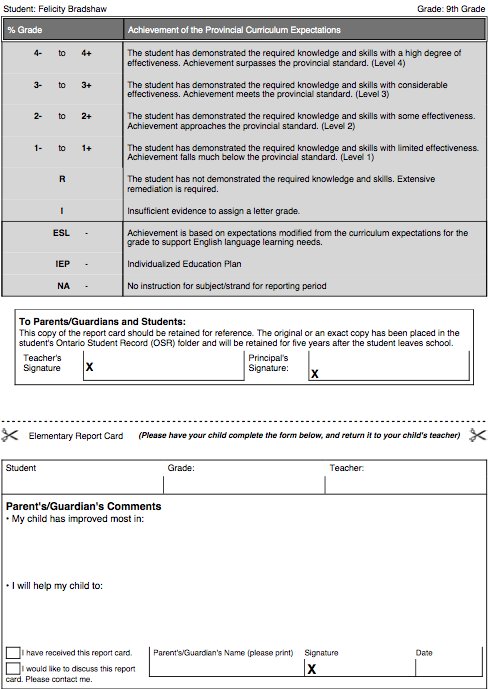 Since this fabulous report card is similar to the progress report design by the Ontario Province Ministry of Educationstandards, this trimeter-based template has plenty of neat features that allow for tons of feedback from teachers to families. There are separate sections for Behavior and Academic grades, concise Subject-Specific criteria, and plenty of space for comments. The subject-specific criteria comes prepared so that whenever a grading criteria is made, there is a checkbox for whether a student receives IEP or ESL support in that area.