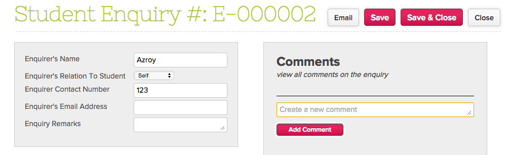 This screen simply shows all emails sent from this module, either all emails related to Applications or emails related to Inquiries (depending on which sub-module you’re on).