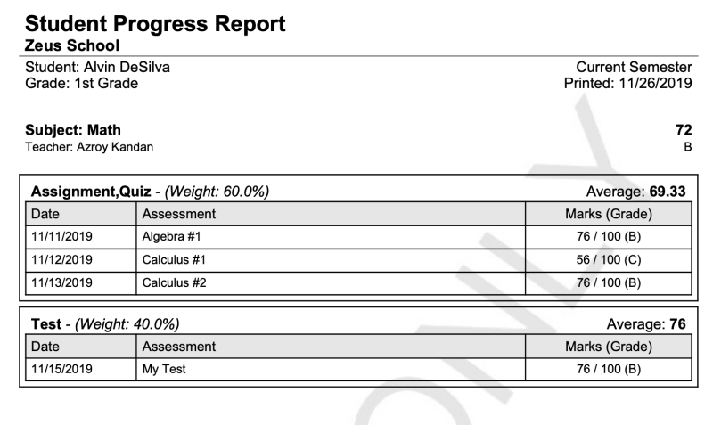 Here’s another example of the Gradebook Progress Report PDF, available when teachers print the Progress Report from the Gradebook. This PDF is for a specific subject, and can contain multiple students to be printed together: