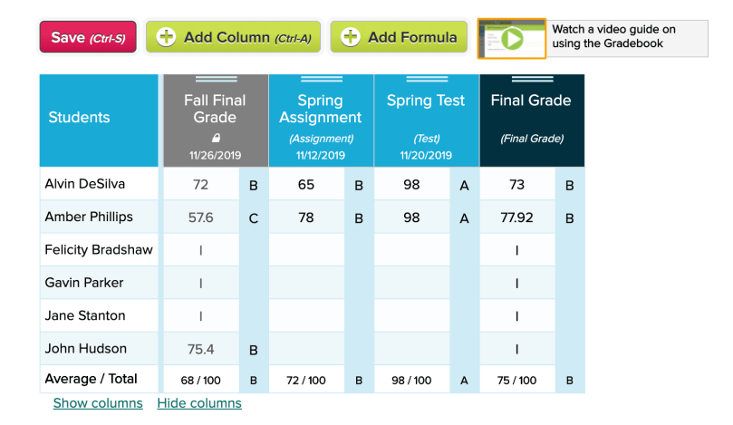 Selected terms from the “Term Grades” section will appear as grey columns within your Gradebook as a reference, and is READ-ONLY.