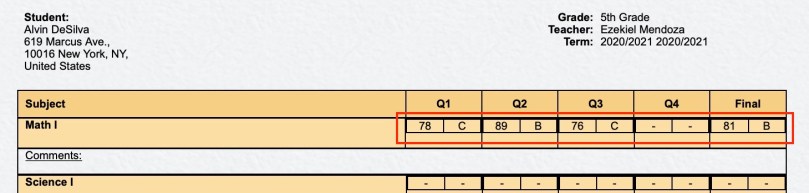 As each report card is generated, the template will pick up the corresponding grades from the admin columns. As shown below, the report card grades match those in the gradebook.