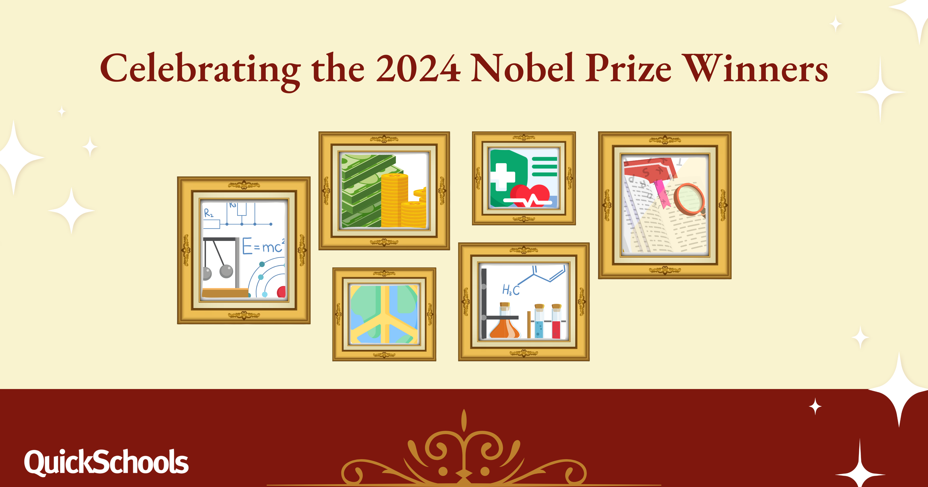 Every year, the Nobel Prizes honor remarkable achievements across diverse fields. Each one deepening our understanding of the world and inspiring progress. With a legacy spanning over a century, these awards represent the enduring power of human curiosity, dedication, and resilience. At QuickSchools, we celebrate this impact, sharing stories that spark curiosity and encourage new generations to explore, discover, and innovate. Let’s dive into the Nobel Prize categories before we take a look at the 2024 Nobel Prize Winners