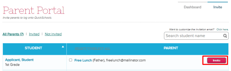 Invite the dummy parent account by going to the Parent Portal > Invite tab > Click on the Invite button for the dummy parent.