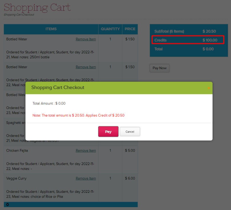 Once credits have been added for the Parent, you can order lunch via the Parent Portal and checkout using the credits.