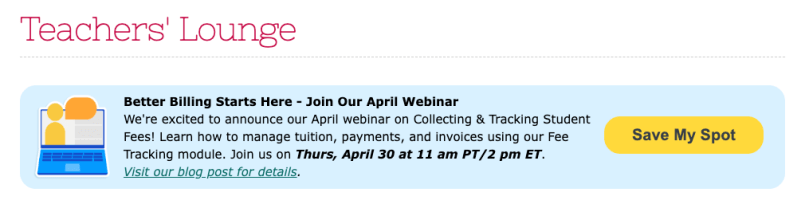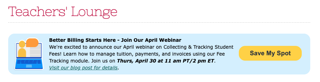 Our next webinar will focus on QuickSchools’ Fee Tracking module. This module includes many great features to explore: online payments, invoicing, payment receipts, family billing, personalized fee lists, reporting, and easy tracking of student balances.