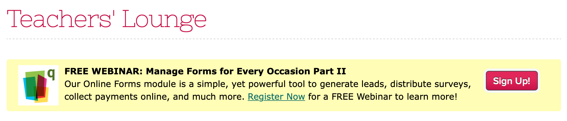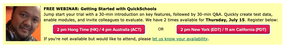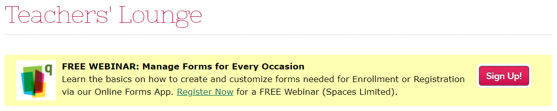 The Getting Ready with QuickSchools webinar is scheduled for August 19th, with two possible time slots for you to choose from – 10 AM (PDT) / 1 PM (EDT) or 1 PM (PDT) / 4 PM (EDT). If you’re interested, you can register by logging onto your QuickSchools account. The registration link is available on the Teachers’ Lounge page.