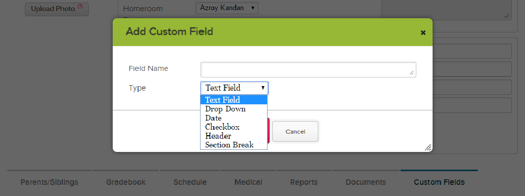When we first introduced Module-Based Custom fields last year at QuickSchools, we only had support for text fields and dropdowns (in addition to Headers and Section breaks for formatting). Soon after, we introduced the Date field. And now we’re happy to support check boxes too, as a custom field type for all related modules.