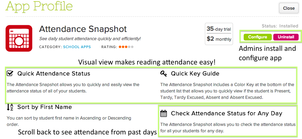 Several schools that use the awesome QuickSchoolsAttendance module had requested an at-a-glance visual of attendance for all students. The app developers heard your ideas, and now we have a great app to show students attendance for each day. Let’s take a look at this awesome Attendance Snapshot app!