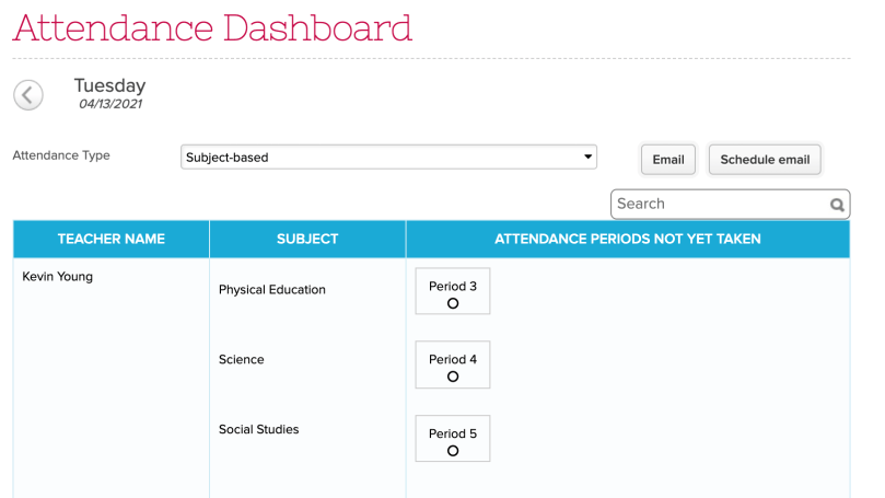 This new feature would display the periods of a given day where attendance is Not Yet Taken. It is applicable for Homeroom, Period, or Subject-Based Attendance, and allow the Global Attendance Takers to either (1) Take attendance on behalf of the teacher; or (2) Send an Email notifying the teacher of the attendance yet to be taken.