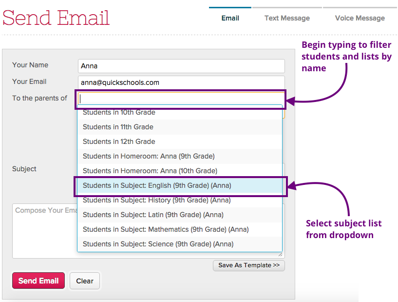 Just like how you can mass message parents and students by grade and homeroom list, you can now mass message by subject lists. This upgrade is up and running for all schools. Let’s check it out!