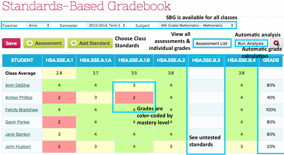 The SB Gradebook is designed to give teachers and administrators an at-a-glance view of students’ performance for each standard taught in class. Not only does it automatically average students’ grades for a standard by using a formula that schools can choose and configure, but it also has a colorful display that is great for highlighting notable standards or students’ grades. Here’s a look at a sample Gradebook.